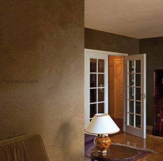 Экологически чистая акриловая краска для интерьеров, для воспроизведения эффекта ткани, придаёт стенам исключительную изысканность, красоту отражения, ещё более подчёркивая их элегантность и эксклюзив при помощи других материалов.